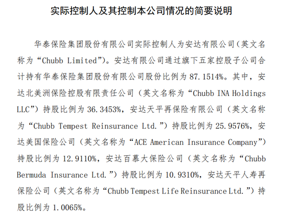 华泰保险集团官网披露的《实际控制人及其控制本公司情况的简要说明》显示,安达有限公司通过5家子公司合计持有华泰保险集团87.1514%股份,其中安达北美洲保险控股有限责任公司持股36.3453%,安达天平再保险有限公司25.9576%,安达美国保险公司12.9110%,安达百慕大保险公司10.9310%,安达天平人寿再保险公司1.0065%。